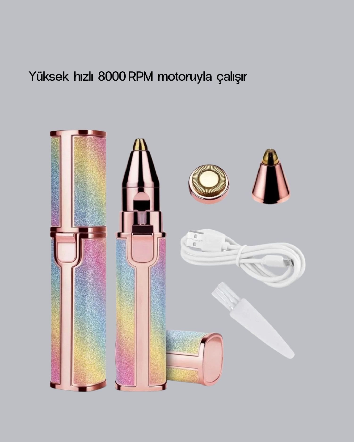 Günlük bakımda profesyonel sonuçlar almak isteyenler için tasarlanan bu mini yüz ve kaş epilatörü, güçlü 8000 RPM motoruyla tüyleri hızlı ve etkili şekilde temizler.Yüz, dudak, çene ve kaş bölgesinde pürüzsüz bir görünüm elde etmenizi sağlar. Hassas ciltler için özel olarak geliştirilen paslanmaz çelik bıçakları, cildi çekmeden veya tahriş etmeden nazik bir tıraş sunar.Şarjlı tasarımı sayesinde pil değiştirme derdine son verir. USB kablosu ile kolayca şarj edilir ve uzun süre kullanılabilir. Kompakt boyutu sayesinde makyaj çantanızda, valizinizde veya cebinizde kolayca taşınabilir.ABS+alüminyum gövdesi, dayanıklı yapısı ile uzun ömürlü kullanım sunarken, zarif tasarımı estetik bir görünüm sağlar.Kullanımı son derece basittir: cihazı açın, cildi hafifçe gerin ve dairesel hareketlerle uygulayın. Sonrasında başlığı temizleyerek hijyenik bir şekilde saklayabilirsiniz.Evde, işte veya seyahatte her zaman pürüzsüz bir cilt için en güvenilir yardımcınız olacak. Ağrısız, konforlu ve etkili bakım artık her an elinizin altında!
