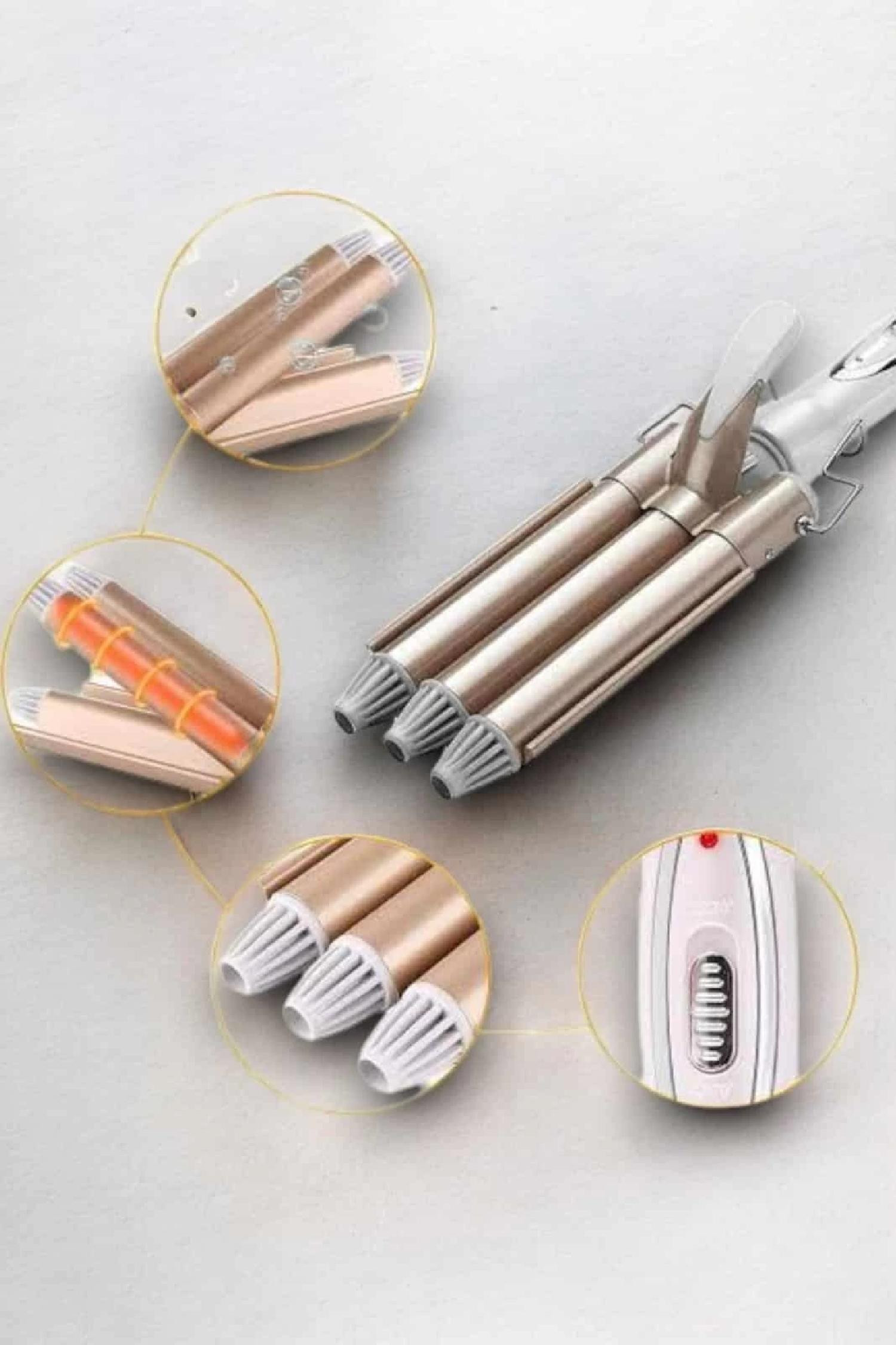 Seramik kaplama teknolojisiyle üretilen bu saç maşası, saçınıza zarar vermeden profesyonel sonuçlar elde etmenize yardımcı olur. Negatif iyon salınımı sayesinde saçtaki elektriklenmeyi azaltır ve doğal parlaklığı korur. 25 mm çapında üç namlulu tasarımı, orta ve uzun saçlarda hacimli ve kalıcı bukleler oluşturur. Hızlı ısınan PTC ısıtma sistemi, 30 saniye içinde 170°C'ye ulaşarak zamandan tasarruf etmenizi sağlar. Ayrıca 220°C'ye kadar ayarlanabilir sıcaklık kontrolü, farklı saç tipleri ve şekillendirme ihtiyaçlarına uygunluk sunar. Kaymaz tutamaç, ısı yalıtımlı ön braket ve haşlanma önleyici üst tasarımıyla güvenli ve pratik bir kullanım deneyimi sağlar. Altın rengi modern tasarımı ile şıklık ve işlevselliği bir arada sunar.